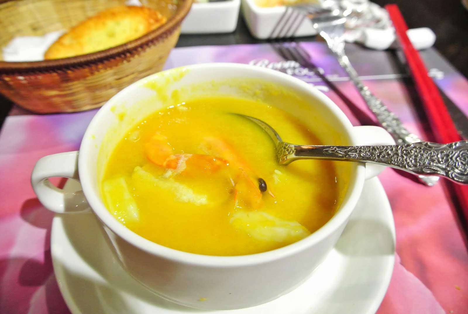 湯底有濃湯和清湯可以選擇,我選了南瓜濃湯的湯底。南瓜味道很濃郁,料有魚、蝦、花枝等等,很豐富!